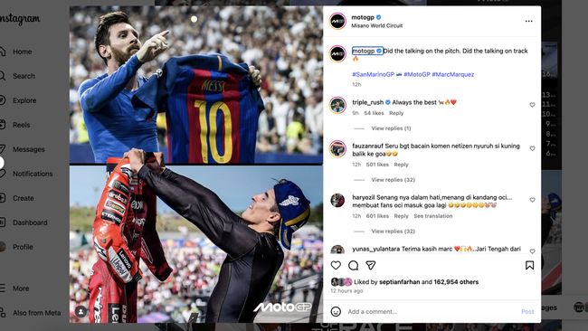 Marc Marquez melakukan selebrasi 'jemur baju' ala Messi usai memenangkan balapan utama MotoGP San Marino 2025 di Sirkuit Misano, akhir pekan lalu. Selebrasi itu pun seolah menjadi balas dendam yang sempurna bagi Marquez kepada publik Misano usai dirinya disoraki saat terjatuh di balap sprint hari Sabtu.