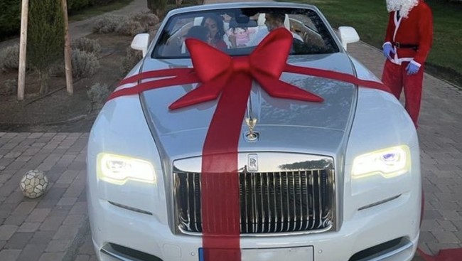 Momen itu dibagikan Ronaldo dalam instagram stories pribadinya @cristiano. Dalam foto terlihat Ronaldo dan Georgina sedang duduk di dalam Rolls-Royce Phantom Cabriolet berpelat AV-55-HS. Di sisi kiri mobil yang masih terpasang pita itu terdapat sosok pria dengan kostum Santa Claus.