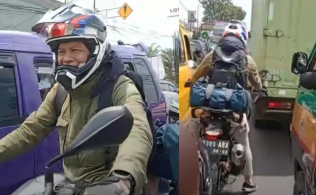 Ariel yang dengan susah payah membelah kemacetan jalan terlihat kelelahan dan kepanasan. Bahkan, dia sempat membuka visor atau kaca helm untuk mengusir pengap akibat suhu tinggi.
