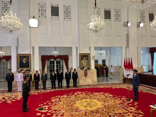 Letjen Agus Subiyanto dilantik sebagai KSAD di Istana Negara, Jakarta, Rabu (25/10/2023) sekitar pukul 09.15 WIB. Pelantikan dihadiri Menko Polhukam Mahfud Md, Kepala KSP Moeldoko, Panglima TNI Laksamana Yudo Margono, Kapolri Jenderal Listyo Sigit Prabowo, KSAL Laksamana Muhammad Ali, KSAU Marsekal Fadjar Prasetyo, Wamenlu Pahala Mansury hingga Seskab Pramono Anung.