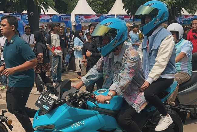 Gibran dan Selvi sama-sama mengenakan helm biru muda. Sementara motor listrik Neu Green yang membawa keduanya ke panggung juga punya warna senada. Mereka nampak kesulitan melintas karena 'lautan' massa yang memenuhi area panggung.