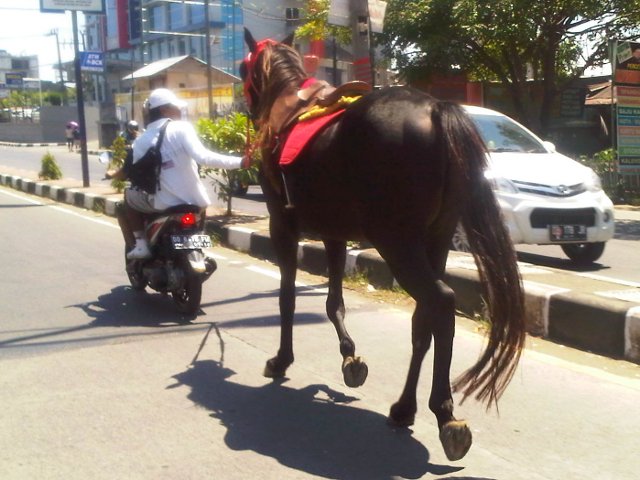 - Pemandangan yang unik terjadi di Makassar. Biasanya kuda menarik andong, cidomo, dokar, atau bendi. Tapi di Makassar ada motor yang menarik kuda.