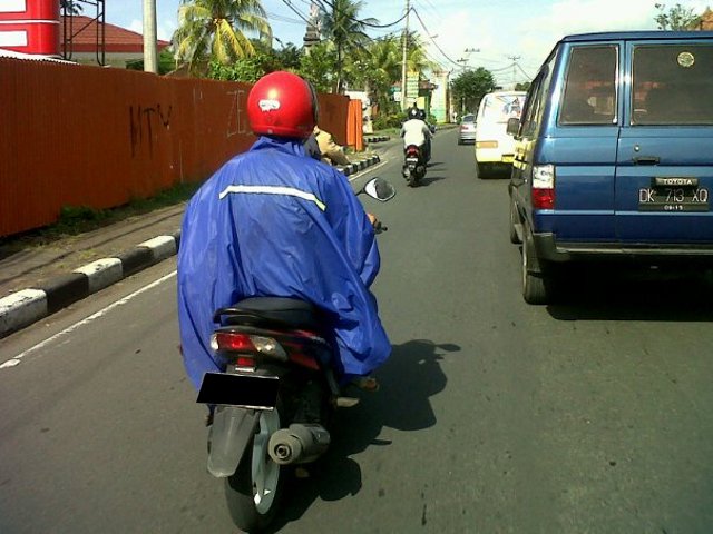 - Menggunakan jas hujan di saat matahari terik pasti terasa menyiksa. Namun bagi pengendara motor ini, hal tersebut tak masalah.