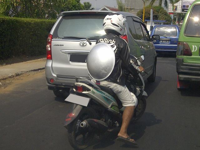 - Seorang pengendara motor menggendong wajan besar di punggungnya. Mengingatkan kita pada film kartun Kura-kura Ninja.