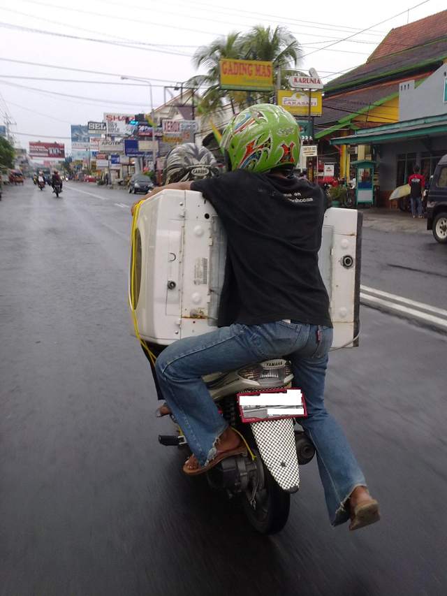 - Pengendara motor kerap kali mengabaikan keselamatan diri dan pengguna jalan lain. Lihat saja aksi pengendara motor ini yang membawa mesin cuci.
