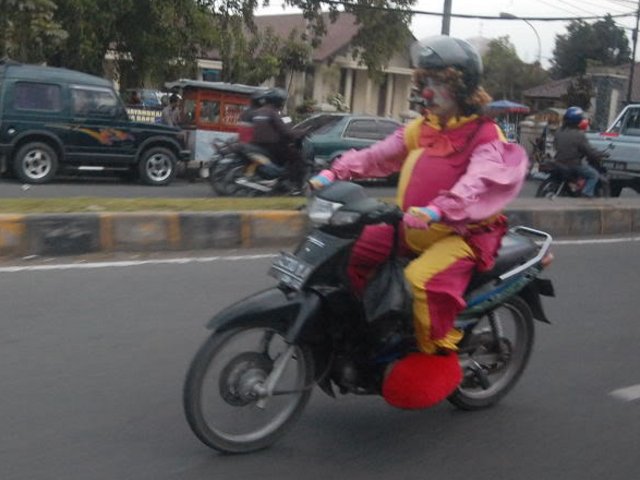 Badut Naik Motor Membawa oleh-oleh untuk anak hasil dari menghibur anak orang lain (Foto Pramudhia Dwi Harsanto).