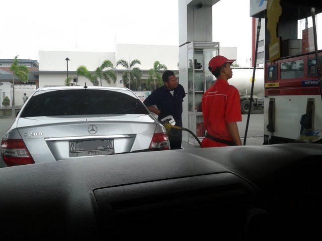 - Sebuah mobil mewah Mercedes-Benz C-Class terlihat tengah mengisi BBM dengan bahan bakar subsidi.