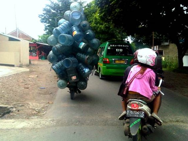 - Sebuah motor dijejali oleh galon-galon kosong yang menggunung. Butuh usaha yang keras dan penuh kehati-hatian untuk mengendalikan motor supaya tetap stabil.