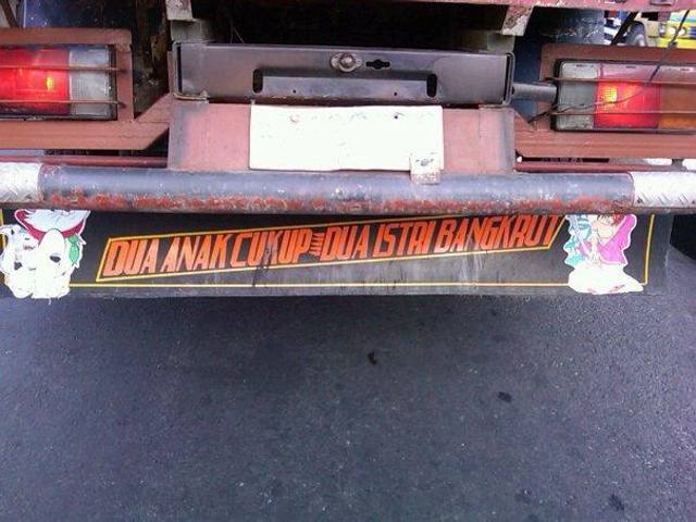 Sopir Truk dan Program KB Foto ini saya ambil dengan penuh perjuangan, sepanjang lebih 5 km saya membuntutinya. Akhirnya terima kasih saya kepada kereta Lodaya yang telah menghentikan truk ini di perlintasan KA. (Foto: Nitya Raharjanta).