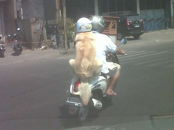 Jakarta - Sebuah pemandangan unik terlihat di Surabaya. Anjing jenis golden retriever rupanya bisa berlaku tertib di jalanan. Anjing ini memakai helm di kepalanya!