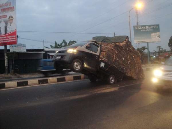- Sebuah mobil pikap dengan muatan berisi kardus-kardus terjungkal di Banten. Roda depan mobil terangkat ke atas.