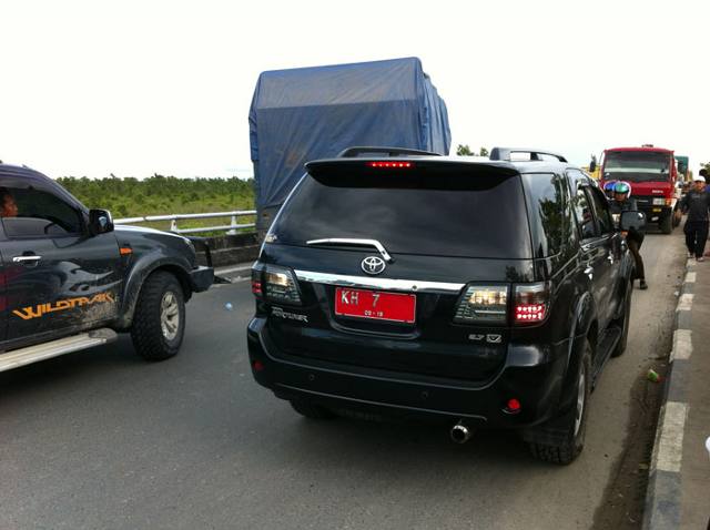 - Sebuah mobil berpelat merah mencoba menerobos lalu lintas yang tengah padat di Jembatan Tumbang Nusa, Kalimantan Tengah.