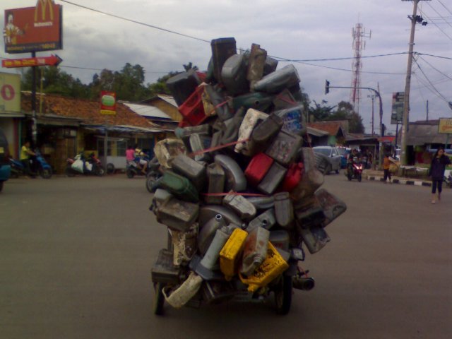 - Seorang pengendara motor yang melintas di Jl. Pemda - Cibinong membawa begitu banyak jeriken sehingga menyerupai gunung jeriken.