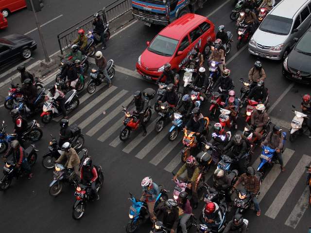 Jakarta - Nasib para pejalan kaki di saat harus menyeberang jalan yang dipenuhi motor yang sedang menunggu lampu merah.