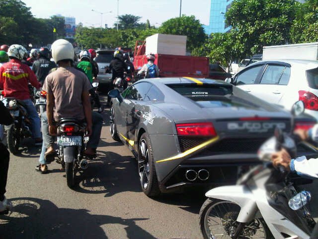 Lambo Terjebak Macet Mobil difoto di kawasan Simprug, Jakarta Selatan. Lambo ini pun menjadi perhatian masyarakat yang kebetulan berpapasan. "Mobil Ferrari itu ya, kasian," ujar seorang biker yang lewat. 'Lamborghini mas!