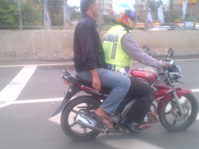 - Petugas polisi yang membonceng seorang pria tanpa mengenakan helm terlihat memasuki jalan tol, karena jalan biasa macet parah.