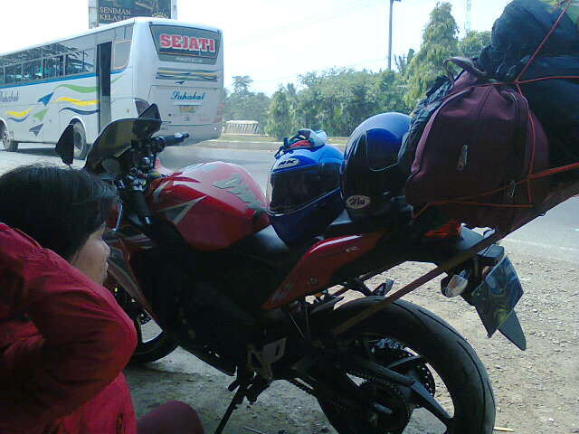 Honda CBR 'Overload' Pemilik motor tengah beristirahat di sela perjalanan mudik. (Foto Mirzah Jozz). Dengan 'bagasi' tambahan, bisa bawa barang banyak. (Foto Mirzah Jozz).