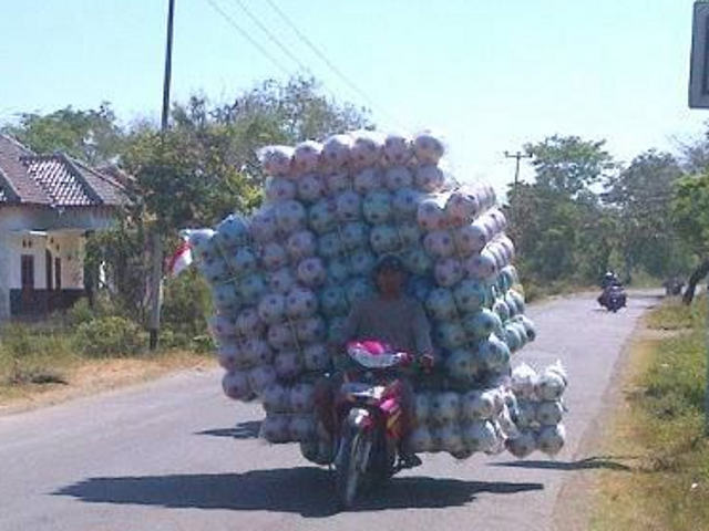 - Pengendara motor ini membawa tumpukan bola yang menjulang ke atas dan melebar ke samping. Sangat berbahaya jika menyenggol kendaraan lain.