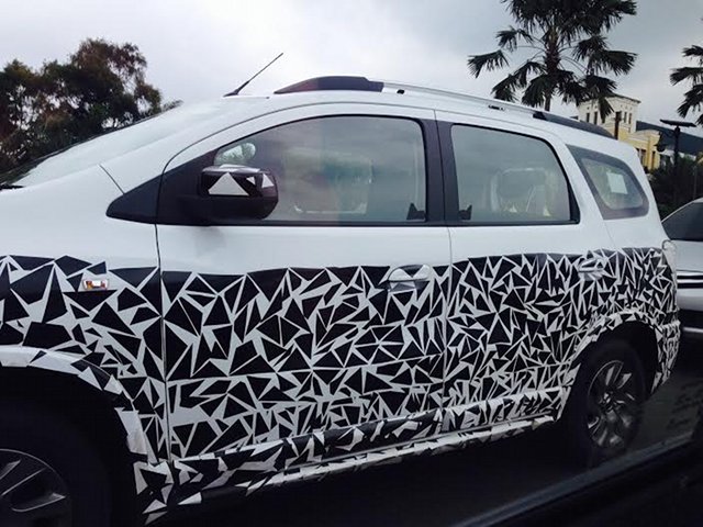 Chevrolet Spin Facelift? Chevy Spin dengan stiker kamuflase terlihat di Jalan Raya Serpong. (Foto Kevin Wijaya). Semua emblem maupun logo ditutupin rapat-rapat oleh pihak GM. (Foto: Kevin Wijaya).