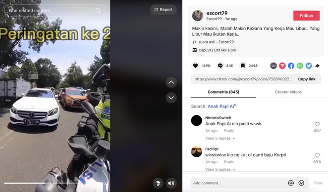 Video itu diunggah akun TikTok escort79. Dalam video tersebut tampak petugas sedang melakukan pengawalan terhadap salah satu kendaraan pejabat yang sedang bertugas. Namun, mobil Mercedes-Benz berkelir putih mencoba membuntuti di belakang mobil yang dikawal itu.