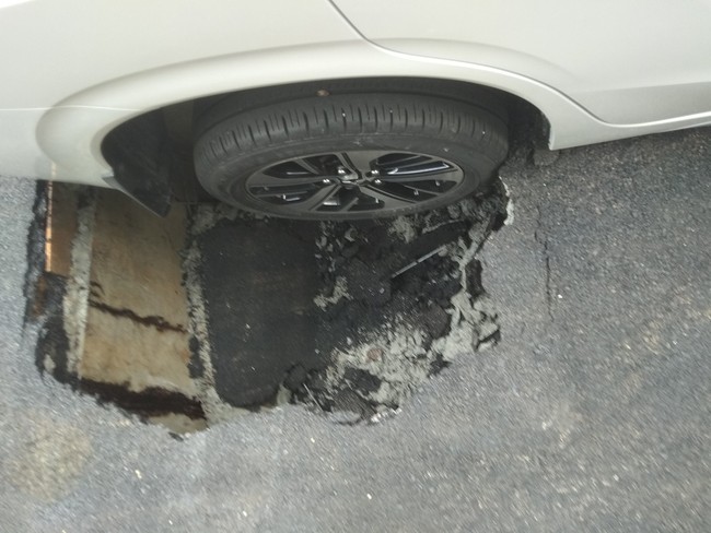 Mobil berwarna putih terperosok ke lubang sumur resapan itu. Satu roda mobil menyangkut di lubang. Lapisan atas sumur resapan itu jebol. Terlihat tiang beton juga luluh lantak ambles ke bawah.