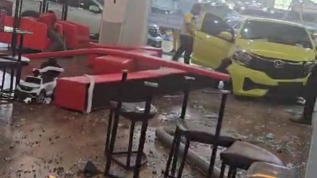 Mobil tersebut berhenti setelah menabrak tiang pondasi dan menyebabkan kaca salah satu sisi showroom pecah berserakan. Tampak juga banyak pelanggan yang sedang berada di lokasi. Beberapa bangku tunggu berwarna merah juga terlihat tertabrak.